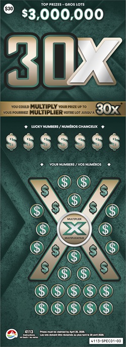 • Les valeurs MULTIPLICATEURS de 2X, 3X, 5X, 10X s’appliquent uniquement aux catégories de lots de 30 $, 50 $, 100 $, 150 $, 250 $ et 1 000 $. La valeur 30X s’applique uniquement aux catégories de lots de 30 $, 50 $, 100 $, 150 $, 250 $, 1 000 $ et 100 000 $.